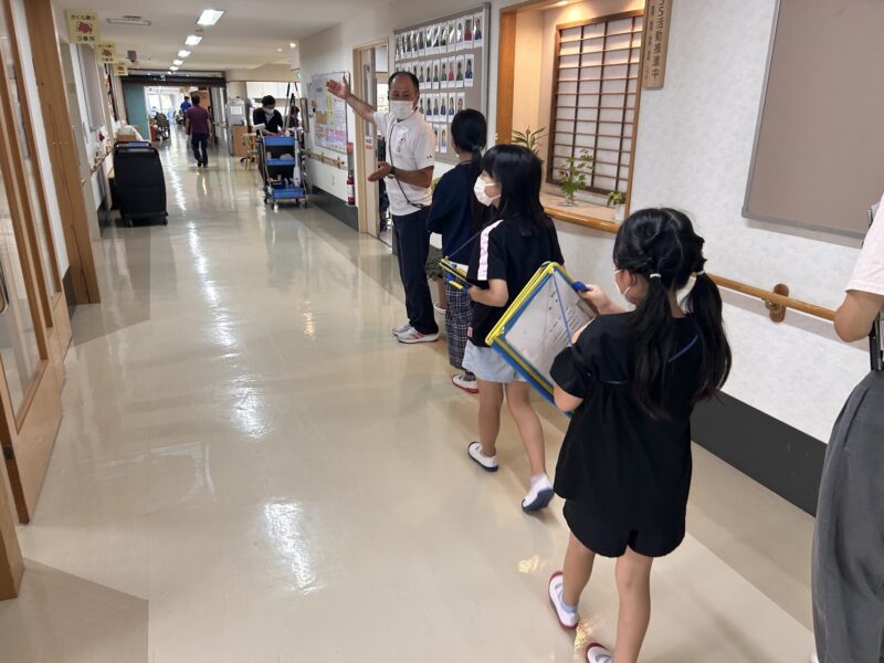 近隣のいつま小学校4年生の児童が、福祉授業の一環として当施設を訪問されました。地域の高齢化が進む中、次世代を担う子どもたちに福祉の現場を知ってもらう貴重な機会となりました。児童たちは、施設内の見学を通じて、入居者の生活の様子や職員の仕事について学びました。